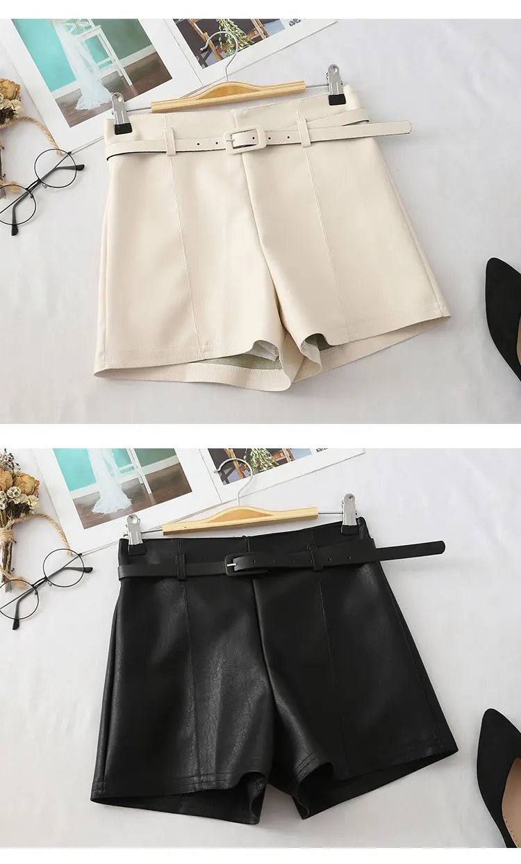 lower price Casual PU Leather Shorts For Women High Waist Sashes Wide leg Shorts autumn Spring Summer Loose Ela